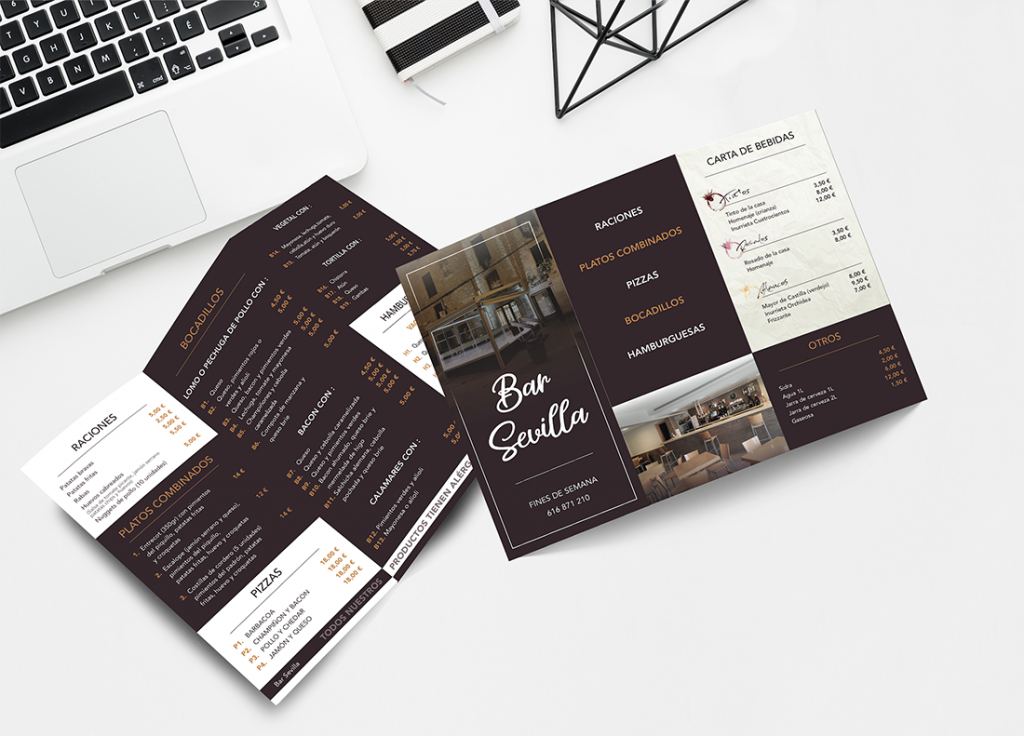 Sobre el proyecto: Creación de papelería publicitaria en forma de tríptico para el Bar Sevilla de Mendigorria (Navarra).